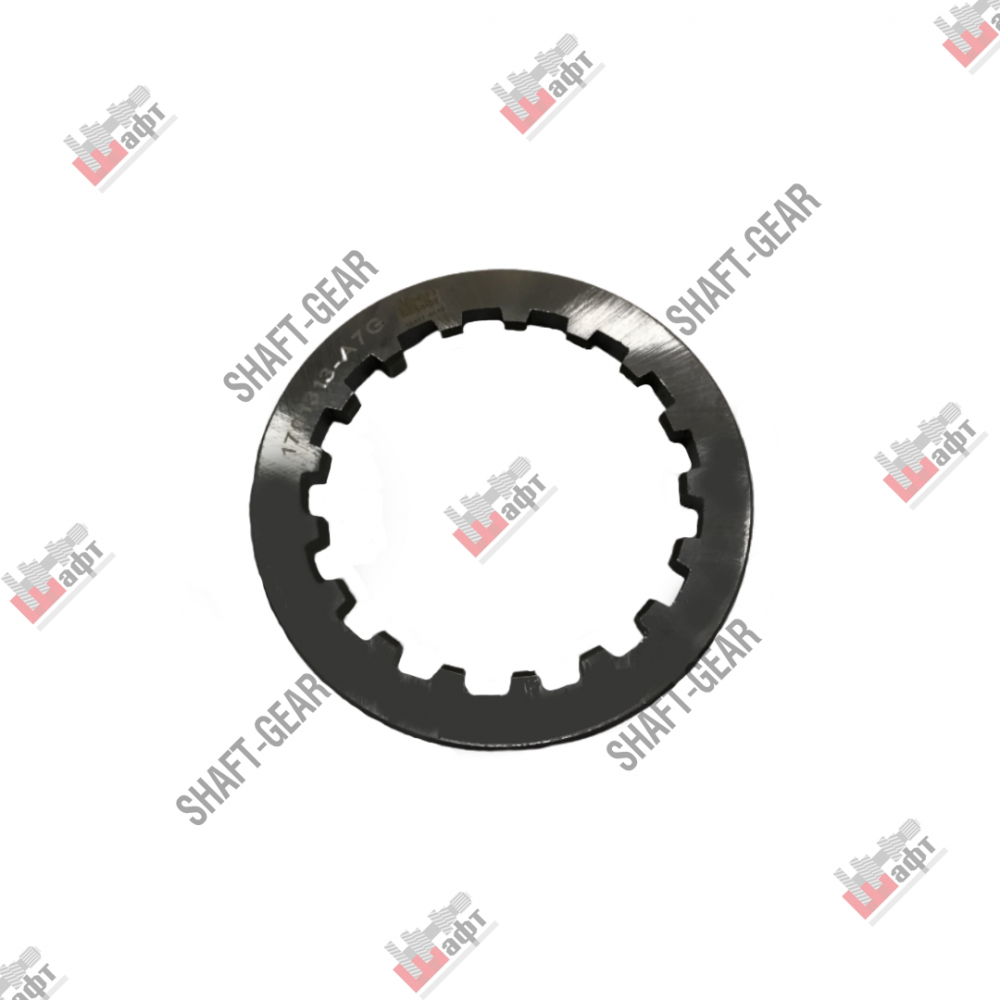 Шайба бренда Shaft-Gear на КПП CA12TA(X)160/190/210M — артикул 1701313-A7G. Размеры: наружный диаметр — 72 мм. внутренний диаметр — 57,5 мм, толщина — 6,3 мм, количество внутренних шлицов — 17.